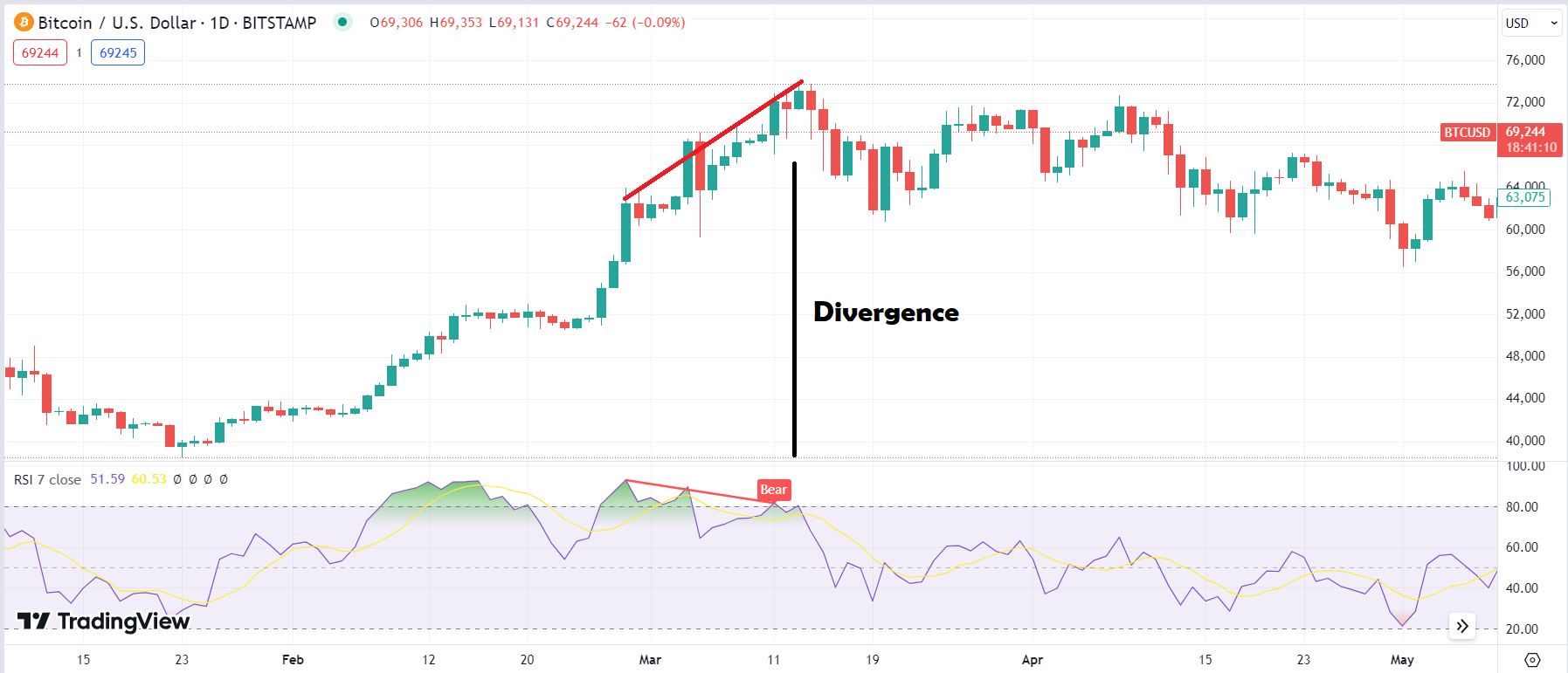Divergence سرفنگ کے دوران ہوا کی سمت میں تبدیلی کی طرح ہوتا ہے۔ جب کسی ایسٹ کی قیمت ایک سمت جارہی ہو اورRSI دوسری سمت میں جا رہا ہو، تو یہ ممکنہ ریورسل کا اشارہ ہوتا ہے۔ مثال کے طور پر، اگر قیمتیں بڑھ رہی ہوں لیکن RSI گر رہا ہو، تو یہ اس بات کا اشارہ ہو سکتا ہے کہ اوپر کی طرف جانے والا ٹرینڈ اپنی طاقت کھو رہا ہے اورجلد ہی نیچے کی طرف آسکتا ہے۔