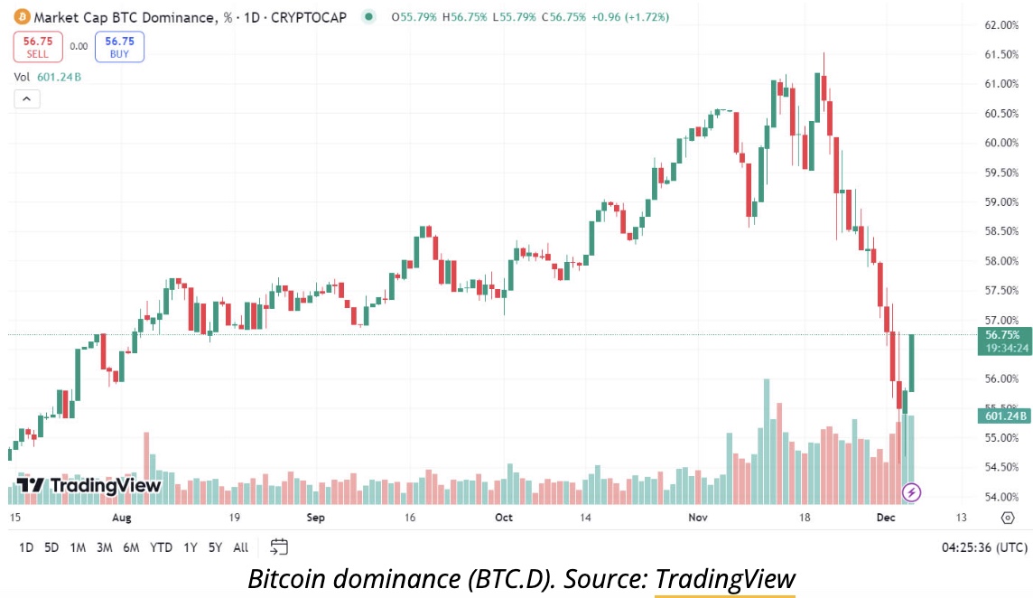- Bitcoin’s dominance climbing to 57% signals a temporary pause in altcoin activity as investors focus on BTC’s rally.