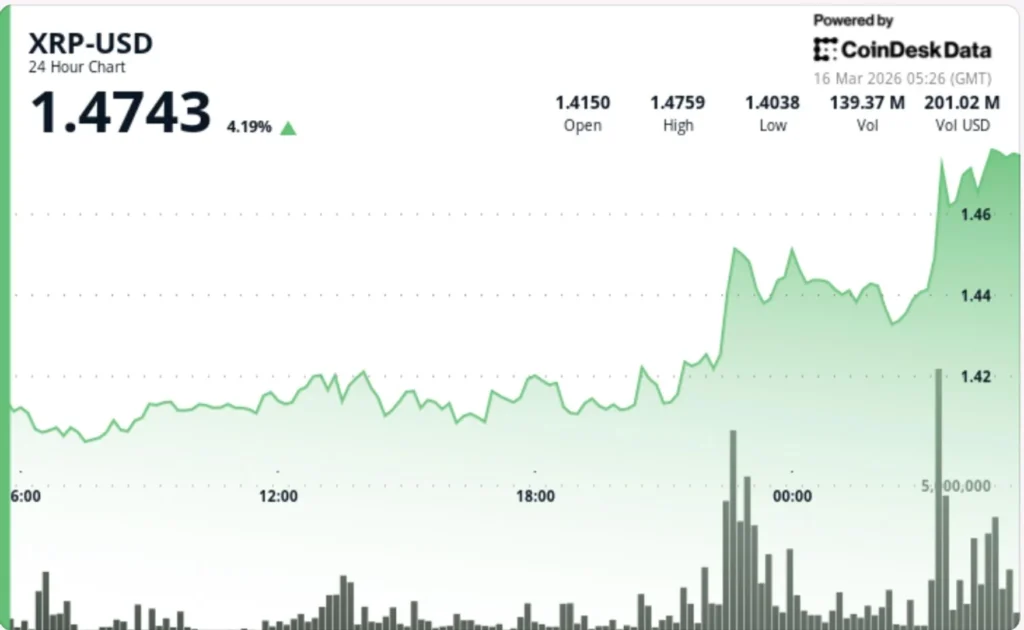 XRP climbs 3% past $1.47 as breakout extends on broad bitcoin-led move