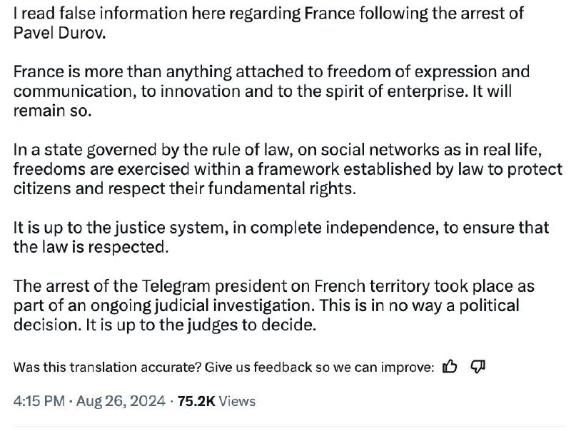 🇫🇷 JUST IN: French President Emmanuel Macron states that Telegram CEO Pavel Durov’s arrest was part of a judicial inquiry, dismissing any political motives.n