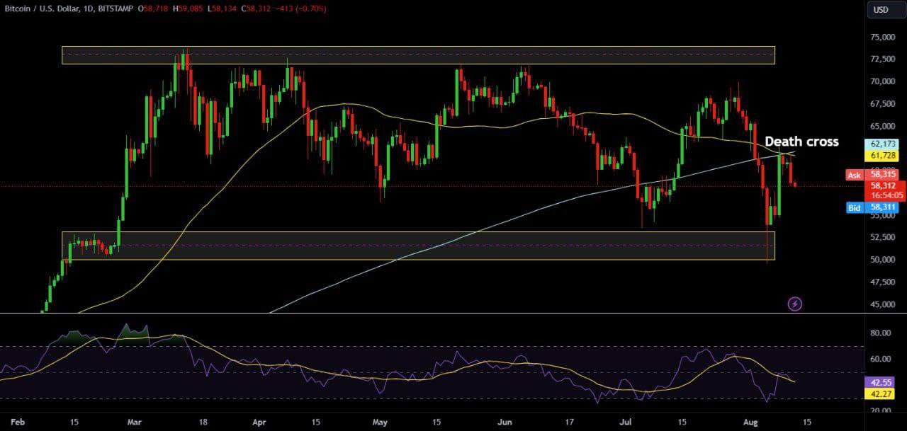 Bitcoin has experienced a death cross, and as we expected, its price is going down..