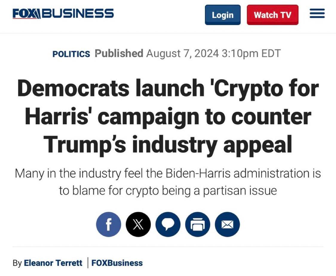JUST IN: 🇺🇸 Democrats launch “Crypto for Harris” campaign to counter Donald Trump — FOX Business 👀
