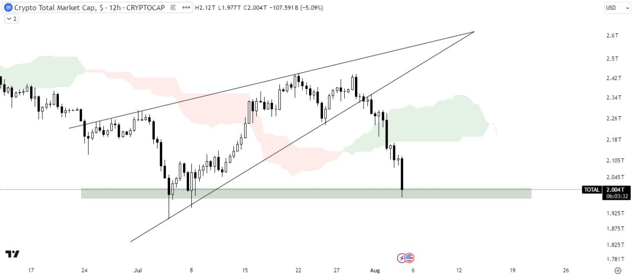 The total cryptocurrency market cap is experiencing a downward movement following the breakdown of a rising wedge pattern. The Ichimoku cloud is acting as resistance above the price action.