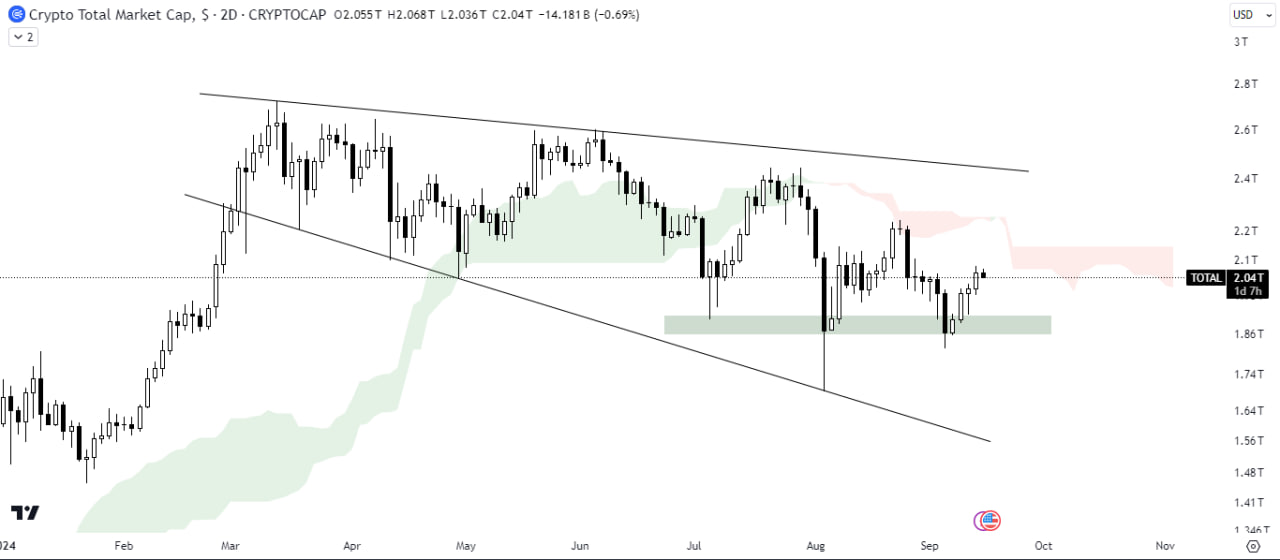 The total cryptocurrency market cap is consolidating within a descending broadening wedge pattern and is currently rebounding from a horizontal demand zone. The Ichimoku Cloud is acting as resistance above the price action.