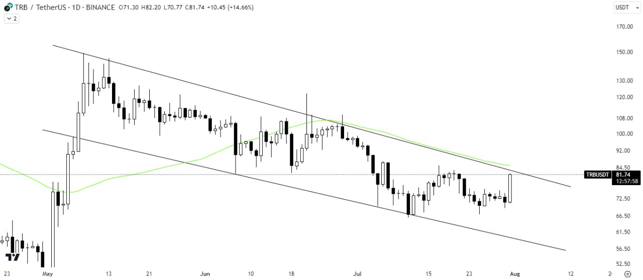 TRB is currently consolidating within a descending channel, displaying signs of bullish strength. A breakout above the channel and the 50-day moving average could signal a strong bullish rally.