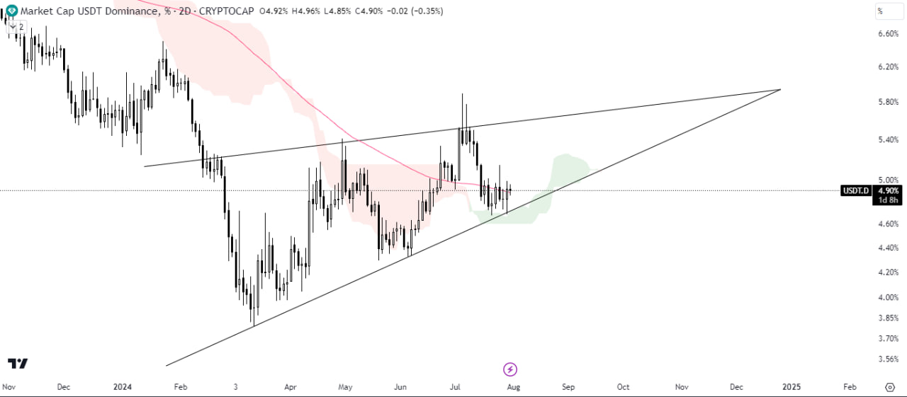 However, a breakdown of the pattern would signal a bearish trend. It’s important to note that USDT.D typically moves inversely to the broader crypto market.n