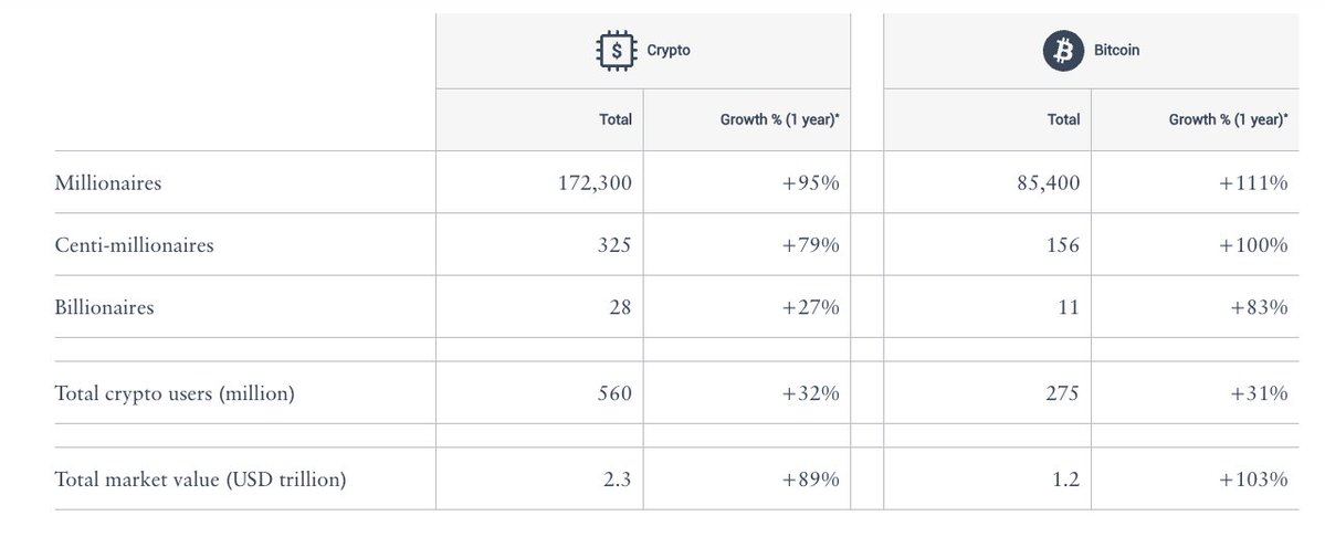 📈 The number of Bitcoin millionaires around the world has grown 111% in the last year, according to a new report on crypto wealth.