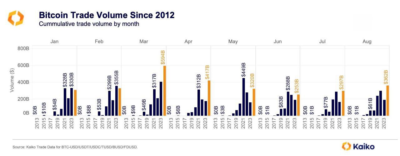 March, April, July, and August each saw record-breaking BTC trade volumes compared to previous yearsn
